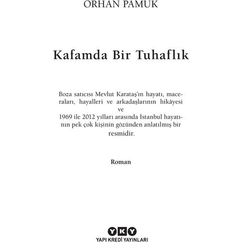 Kafamda Bir Tuhaflık hem bir aşk hikâyesi hem de modern bir destan. Orhan Pamuk’un üzerinde altı yıl çalıştığı roman, bozacı Mevlut ile üç yıl aşk mektupları yazdığı sevgilisinin İstanbul’daki hayatlarını hikâye ediyor.