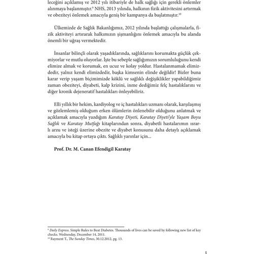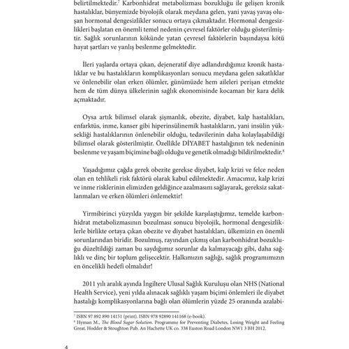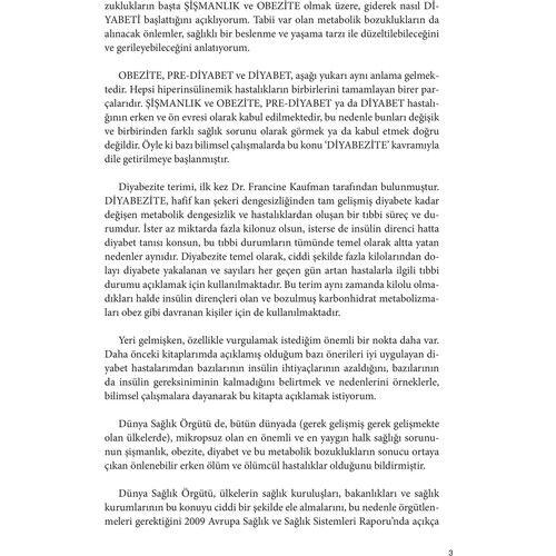 İnsülin direncini kırmanın, hipoglisemiyi önlemenin ABC’si! İnsanlar bilinçli olarak yaşadıklarında, sağlıklarını korumakta güçlük çekmiyorlar ve mutlu oluyorlar. İşte bu sebeple sağlığımızın sorumluluğunu kendi elimize almak ve korumak, en ucuz ve kolay yoldur. Hastalanmamak elimizdedir, yalnız kendi elimizdedir, başka kimsenin elinde değildir! Bizler buna karar verip yaşam biçimimizde köklü ve sağlıklı değişikler yapabildiğimiz zaman obeziteyi, diyabeti, kalp krizini, inme dediğimiz felç hastalıklarını ve diğer kronik dejeneratif hastalıkları önleyebiliriz. Prof. Canan Efendigil Karatay, satış rekorları kıran ilk üç kitabıyla Türkiye’de bir ‘sağlıklı halk hareketi’ başlattı. Bu kitapları okuyanlar hem kolayca zayıfladı hem de kalıcı kilo verdiren geleneksel Türk mutfağıyla tanıştı. Ezber bozan Profesör Canan Efendigil Karatay, bu kez diyabete çözüm sunuyor. Ona göre şişmanlık, obezite ve diyabet birbirinden ayrılamaz hastalıklar. Hatta çoğu kez bunlara kalp ve damar hastalıkları da eşlik ediyor. Dolayısıyla beslenme ve yaşam biçimini Karatay prensiplerine göre yeniden düzenlemek, birçok metabolik hastalıktan da kurtulmak anlamına geliyor. Elinizdeki kitap diyabet hastalarından gelen yoğun talebe yanıt vermek için yazıldı. Prof. Canan Karatay her zamanki anlaşılır üslubuyla obezite ve diyabet hastalığının nasıl geliştiğini ve nasıl düzeltilip önlenebileceğini anlatıyor. Her tür şekerin vücuda nasıl zarar verdiğini gözler önüne seriyor. İnsülin direncinden, hipoglisemi ataklarından ve insülin takviyesinden kurtulmanın şifrelerini veriyor! Türkiye’deki 20 milyon fazla kilolu, 20 milyon obez ve 10 milyon diyabetliye şimdiden hayırlı olsun! Çünkü kitaptaki tavsiyelere uyarak ‘sağlıklı ve mutlu bir hayata tekrar merhaba’ demek artık çok kolay!