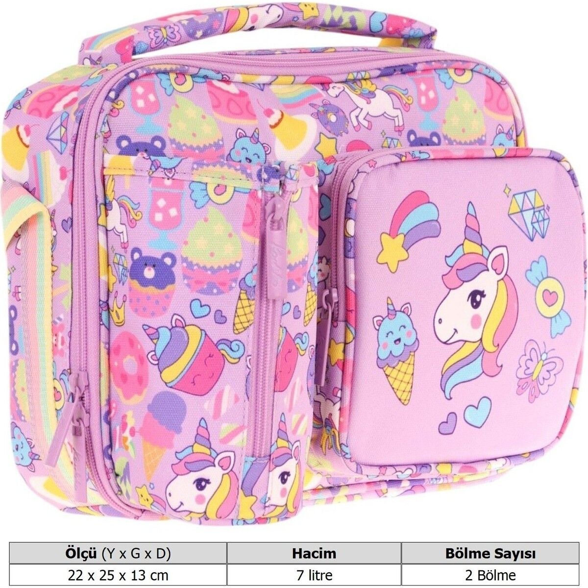 Kaukko Kız Çocuk, Lila, Unicorn Desenli Isı Yalıtımlı Üç Bölmeli (Matara Cepli) Okul Beslenme Çantası L7215