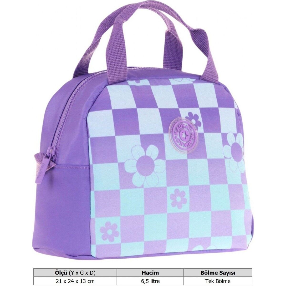 Bu şık ve kullanışlı beslenme çantası, kız çocukları için özel olarak tasarlandı! mor mavi tonlarındaki göz alıcı rengi ve papatya ve dama baskılı deseniyle hem okulda hem de piknikte tarzını konuşturacak.