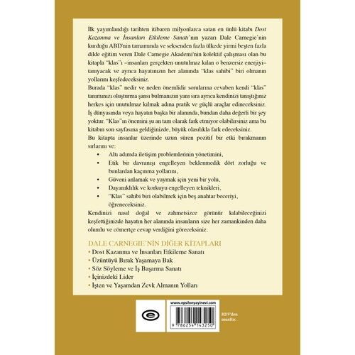 İlk yayımlandığı tarihten itibaren milyonlarca satan en ünlü kitabı Dost Kazanma ve İnsanları Etkileme Sanatı’nın yazarı Dale Carnegie’nin kurduğu ABD'nin tamamında ve seksenden fazla ülkede yirmi beşten fazla dilde eğitim veren Dale Carnegie Akademi'nin kolektif çalışması olan bu kitapla “klas”ı –insanları gerçekten unutulmaz kılan o benzersiz enerjiyi– tanıyacak ve ayrıca hayatınızın her alanında “klas sahibi” biri olmanın yollarını keşfedeceksiniz. Burada “klas” nedir ve neden önemlidir sorularına cevaben kendi “klas” tanımınızı oluşturma şansı bulmanızın yanı sıra kendinizi tanıştığınız herkes için unutulmaz kılmak adına pratik ve güçlü araçlar edineceksiniz. İş dünyasında veya hayatın başka bir alanında, bundan daha değerli bir şey yoktur. “Klas”ın önemini şu an tam olarak fark etmiyor olabilirsiniz ama bu kitabın son sayfasına geldiğinizde, büyük olasılıkla fark edeceksiniz. Bu kitapta insanlar üzerinde uzun süren pozitif bir etki bırakmanın sırlarını ve: • Altı adımda iletişim problemlerinin yönetimini, • Etik bir davranışı engelleyen beklenmedik dört zorluğu ve bunlardan kaçınma yollarını, • Güveni anlamak ve yaymak için yeni bir yolu, • Dayanıklılık ve korkuyu engelleyen teknikleri, • “Klas” sahibi biri olabilmek için beş anahtar beceriyi, öğreneceksiniz. Kendinizi nasıl doğal ve zahmetsizce görünür kılabileceğinizi keşfettiğinizde hayatın her alanında insanların size her zamankinden daha olumlu ve cömertçe cevap verdiğini göreceksiniz.