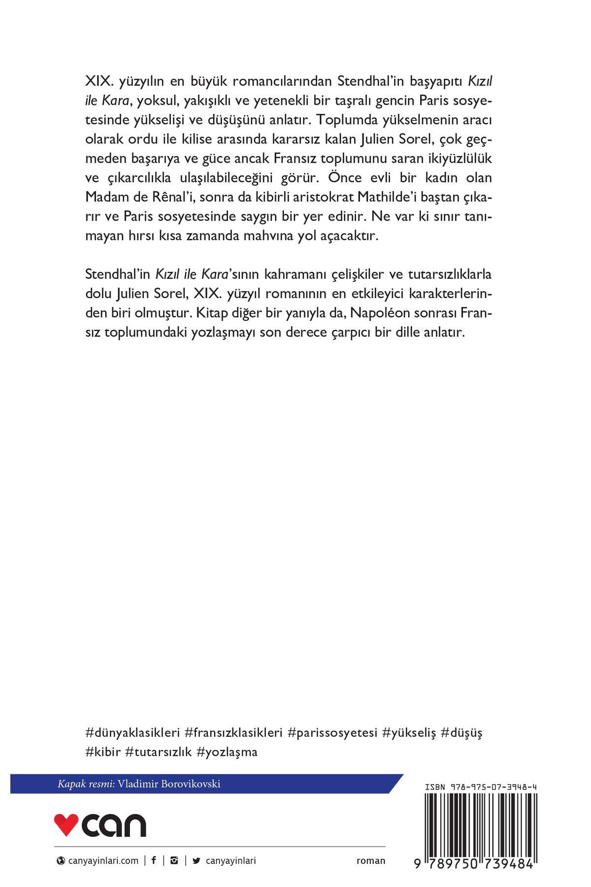 XIX. yüzyılın en büyük romancılarından Stendhal’in başyapıtı Kızıl ile Kara, yoksul, yakışıklı ve yetenekli bir taşralı gencin Paris sosyetesinde yükselişi ve düşüşünü anlatır. Toplumda yükselmenin aracı olarak ordu ile kilise arasında kararsız kalan Julien Sorel, çok geçmeden başarıya ve güce ancak Fransız toplumunu saran ikiyüzlülük ve çıkarcılıkla ulaşılabileceğini görür. Önce evli bir kadın olan Madam de Rênal’i, sonra da kibirli aristokrat Mathilde’i baştan çıkarır ve Paris sosyetesinde saygın bir yer edinir. Ne var ki sınır tanımayan hırsı kısa zamanda mahvına yol açacaktır. Stendhal’in Kızıl ile Kara’sının kahramanı çelişkiler ve tutarsızlıklarla dolu Julien Sorel, XIX. yüzyıl romanının en etkileyici karakterlerinden biri olmuştur. Kitap diğer bir yanıyla da, Napoléon sonrası Fransız toplumundaki yozlaşmayı son derece çarpıcı bir dille anlatır. (Tanıtım Bülteninden) Yazar:Henri Beyle Stendhal Yayınevi:Can Yayınları Basım Yılı:2019 Yai Grubu:3-6 YayinEvi:Can Yayınları Kategori:Dünya Klasik Roman Türü:Dünya Klasik Cilt Bilgisi:İnce Kapak Basım Dili:Türkçe