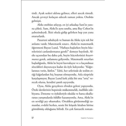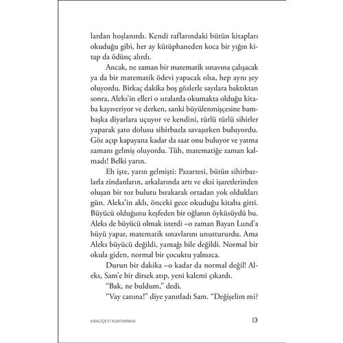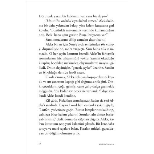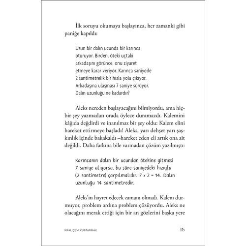 Kraliçeyi Kurtarmak - Vladimir Tumanov\Aleks, yolda buldugu tuhaf kalemin en zor matematik prob¬lemlerini bile çözüverdigini fark edince çok sevindi. Derken, kitapliginda ortaya çikiveren esrarengiz bir kitap, hem onu hem de arkadaslari Sam Ile Vanessa'yi neredeyse esir aldi. Kitapta anlatildigina göre, kötü Kral Rechner'in satosuna hap¬settigi Zümrüt Kraliçe Jayden'in, üzerine kilitlenen kapilari açabilmek Için 400 bilmeceyi çözmesi gerekiyordu. Kraliçeye de ancak çocuklar yardim edebilirdi. Oysa, giderek zorlasan matematik bilmecelerini çözmek olanaksiz gibiydi. Vladimir Tumanov'un pek çok ülkede ayni andayayimlanan bu eglenceli ve sürükleyici kitabinda,çözülmeyi bekleyen birbirinden ilginç matematikbilmeceleri var. Yazarin ikinci kitabi "HaritadaKaybolmak" ise dünyada ilk kezTürkiye'de yayimlandi.\