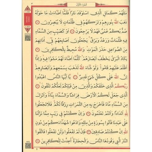 Bu Kur'ânı Kerim, Hafız Osman hattına sadık kalınarak sayfa tutar, berkenar, secavcndli, medli ve kasırlı, Bilgisayar Hatlı Olarak (kolay okunuşlu) hazırlanmıştır.İnceleme: T.C. Diyanet İşleri Başkanlığı Mushafları İnceleme ve Kıraat Kurulu Başkanlığınca mühürlüdür.Kuranı Kerimde sayfa kenarlarında bulunan QR Kodu telefonunuza okuttuğunda o sayfanın Arapçasını ve Mealini sesli dinleyebilir takip edebilirsiniz.QR Kod Seslendirme: Hafız: Fatih ÇOLLAKMeali : Elmalı'lı Muhammed Hamdi Yazır Meali