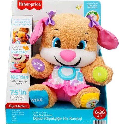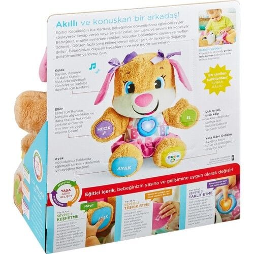 Eğitici Köpekçiğin Kız Kardeşi bebeğinize vücudun bölümlerini, şekilleri, renkleri, sayıları ve çok daha fazlasını öğretir. 100'den fazla ilk kelimeyi, vücudun bölümlerini, renkleri, şekilleri ve daha fazlasını tanıtan şarkılar ve cümlelerle, bebeğinizin dokunuşuna tepki verir! Her bebek kendi hızında gelişir. Köpekçik'in Kız Kardeşi, Yaşa Göre Gelişim teknolojisine sahiptir. Bu teknoloji size, bebeğiniz için en uygun olan aşamayı seçme imkanı verir Her üç oyun seviyesinde de çeşitli şarkılar, sesler ve cümleler bulunur. Üstelik, ışıklı ve çok renkli kalbi müzikle birlikte yanıp söner! 1. Seviye - Keşfetme – Bebeğiniz, ilk kelimelerini, renkleri, alfabeyi, vücudun bölümlerini ve daha fazlasını dinlemek için Köpekçik'in Kız Kardeşi'nin el, ayak, kalp, burun veya kulağına basabilir! Temel sözcükler ve sesler bebeğinizde merak uyandırır ve bebeğiniz keşfetmeye başlar. 2. Seviye - Teşvik Etme - Eğlenceli cümleler, bebeğinizi birlikte saymaya, renkleri bulmaya ve vücudun bölümlerini tanımaya teşvik eder! Bebeğinizi basit sorular ve talimatlarla harekete geçirir. 3. Seviye – Taklit etme – Köpekçik'in Kız Kardeşi, bebeğinizin kelime hazinesini geliştirir. Hayal gücüne dayalı oyunlarla eğlendirirken, şarkılar ve cümlelerle taklit etme oyununa eşlik eder! 3 adet AAA pille çalışır. (Piller dahildir.)