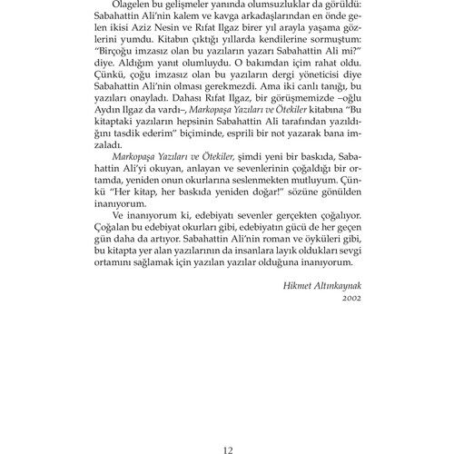Sabahattin Ali nin "düşünür" ve "eleştirmen" yüzünü görmek için, onun dergilerde yayımlanmış yazılarını okumak gerek. Öykü ve romanlarında bir anlatı ustası olduğunu kanıtlayan ve Türk edebiyatının klasikleri arasında yer alan Sabahattin Ali nin gündeme ve sanata ilişkin yazıları, onunla yapılmış söyleşiler Hikmet Altınkaynak ın derlemesiyle dergi sayfalarından sıyrılıp kitap boyutuna ulaşıyor.