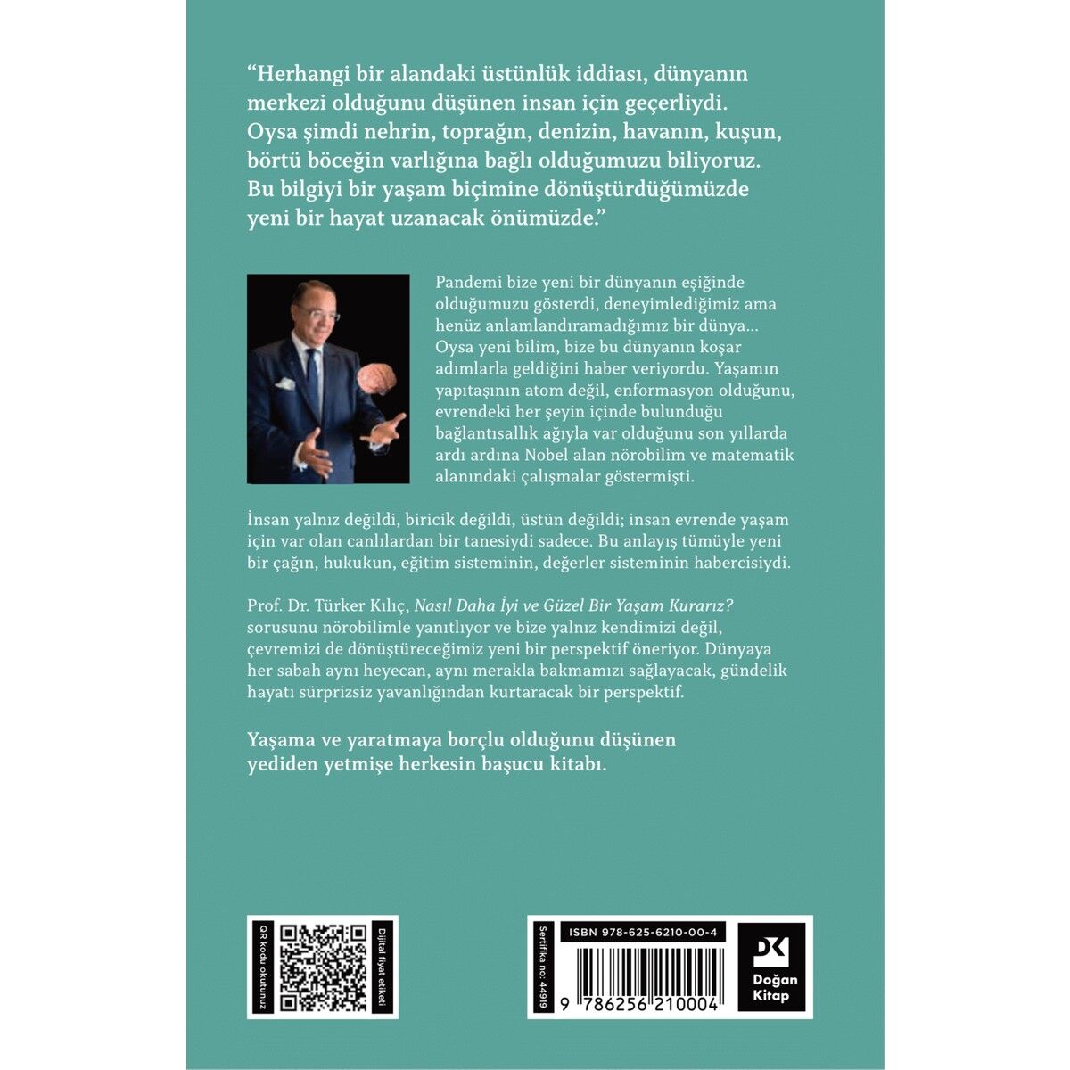 “Herhangi Bir Alandaki Üstünlük İddiası, Dünyanın Merkezi Olduğunu Düşünen İnsan İçin Geçerliydi. Oysa Şimdi Nehrin, Toprağın, Denizin, Havanın, Kuşun, Börtü Böceğin Varlığına Bağlı Olduğumuzu Biliyoruz. Bu Bilgiyi Bir Yaşam Biçimine Dönüştürdüğümüzde Yeni Bir Hayat Uzanacak Önümüzde.” Pandemi Bize Yeni Bir Dünyanın Eşiğinde Olduğumuzu Gösterdi, Deneyimlediğimiz Ama Henüz Anlamlandıramadığımız Bir Dünya… Oysa Yeni Bilim, Bize Bu Dünyanın Koşar Adımlarla Geldiğini Haber Veriyordu. Yaşamın Yapıtaşının Atom Değil, Enformasyon Olduğunu, Evrendeki Her Şeyin İçinde Bulunduğu Bağlantısallık Ağıyla Var Olduğunu Son Yıllarda Ardı Ardına Nobel Alan Nörobilim Ve Matematik Alanındaki Çalışmalar Göstermişti. İnsan Yalnız Değildi, Biricik Değildi, Üstün Değildi; İnsan Evrende Yaşam İçin Var Olan Canlılardan Bir Tanesiydi Sadece. Bu Anlayış Tümüyle Yeni Bir Çağın, Hukukun, Eğitim Sisteminin, Değerler Sisteminin Habercisiydi. Prof. Dr. Türker Kılıç, Nasıl Daha İyi Ve Güzel Bir Yaşam Kurarız? Sorusunu Nörobilimle Yanıtlıyor Ve Bize Yalnız Kendimizi Değil, Çevremizi De Dönüştüreceğimiz Yeni Bir Perspektif Öneriyor. Dünyaya Her Sabah Aynı Heyecan, Aynı Merakla Bakmamızı Sağlayacak, Gündelik Hayatı Sürprizsiz Yavanlığından Kurtaracak Bir Perspektif. Yaşama Ve Yaratmaya Borçlu Olduğunu Düşünen Yediden Yetmişe Herkesin Başucu Kitabı.
