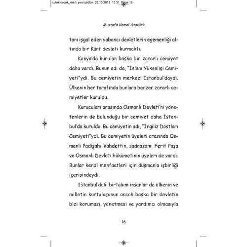 “Küçük hanımlar, küçük beyler! Sizler hepiniz geleceğin bir gülü, yıldızı ve ikbal ışığısınız. Memleketi asıl ışığa boğacak olan sizsiniz. Kendinizin ne kadar önemli, değerli olduğunuzu düşünerek ona göre çalışınız. Sizlerden çok şey bekliyoruz.”M. Kemal Atatürk23 Nisan 1920’de Türkiye Büyük Millet Meclisi’nin açıldığı günü, bağımsızlığı ve gelecek güzel günleri çocuklara armağan eden Mustafa KemalAtatürk’ün bu eserini çocukların sıkılmadan okuyabileceği, anlayabileceği şekilde sunuyoruz. Bu kitapla birlikte, geleceğimizin teminatı olan çocuklar, Mustafa Kemal’in yaşadıklarını,çektiği sıkıntıları,her şeye rağmen hiç bırakmadığımücadelesini ve hepsinden önemlisi bağımsızlığın nasıl ve hangi şartlar altında kazanıldığını daha iyi fark edecekler, bilinçli ve ulusaldeğerlerine sahip çıkan bireyler olmak noktasında bir adım daha atmış olacaklardır.