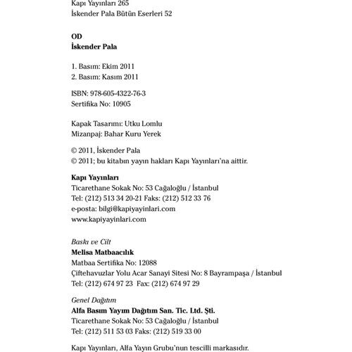 Her yazdığı romanla yüz binlerin kalbini feth eden İskender Pala yeni romanı ‘OD’ ile yeniden okurlarını selamlıyor. Od bir Yunus Emre romanı. Gök kubbemizin her zaman parlayan ve hep çok sevilen, şiirleri gönülden gönüle dolup dilden dile dolaşan Yunus Emre, bu kez OD’un ana kahramanı. İskender Pala’nın ilim ve kültür adamı olmasının yanında, yazar kişiliğinin imbiğinden geçirilerek aşkın tahtına bir kez daha oturtuluyor. 13. yüzyılın her bakımdan kavruk ve yanıp yıkılan ortamına Yunus Emre’nin gelişi tarihi atmosfer içerisinde hakiki anlamına kavuşturuluyor. Yıkıntılar ve yangınlar içinden bir gönül ve bir insanlık anıtının inşa edilişi cümle cümle anlatıyor ve elbette kalbe dokuna dokuna yol alıyor. Romanın her sayfasında Yunus’un hamlıktan saflığa geçişi okunuyor. Biliyorum, “Biz bu ilden gider olduk, kalanlara selam olsun,” demişti… Yine Biliyorum, “Bizim için hayır dua kılanlara selam olsun.” Demişti… Ve Sevgili’ye gittiği o geceden sonra adının dilden dile, Aşkının gönülden gönüle dolaştığını da biliyorum… Şimdilerde ona kimisi Âşık Yunus, Miskin Yunus… Derviş Yunus…Varsın onu da desinler. Ve Türk yurtlarında, onu en çok “Bizim Yunus” diye çağırırlar. Biliyorum.