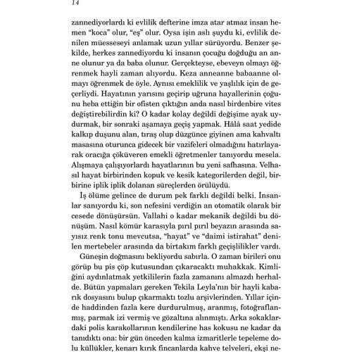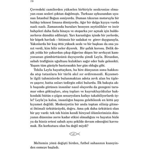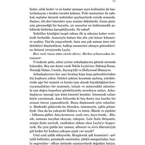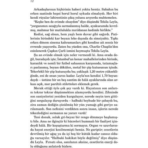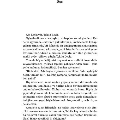 Adı Leyla’ydı. İstanbul’un en eski genelevlerini barındıran o meşum sokakta yer alan gülkurusu renkli evde bilinen adıyla Tekila Leyla. Öyle derdi ona arkadaşları, ahbapları ve müşterileri. Öyle derdi ona beş kadim dostu. Hiç istemezdi Leyla kendisinden geçmiş zaman diliminde söz edilmesini. Ama işte kalbi daha az evvel susmuş, soluk alış verişi ise hepten kesilmişti. Şehrin kenarlarında bir çöp kutusuna bırakılmıştı cansız bedeni. Gene de henüz durmamıştı beyni. Çalışıyordu hâlâ. Tastamam on dakika otuz sekiz saniye boyunca… Yazar Hakkında: Strasbourg doğumlu Elif Şafak, çocukluğunu ve gençliğini Ankara, Madrid, Amman, Köln, İstanbul, Boston, Michigan ve Arizona’da geçirdi. ODTÜ Uluslararası İlişkiler Bölümü’nü bitirdi, yüksek lisansını aynı üniversitede Kadın Çalışmaları Bölümü’nde, doktorasını ise Siyaset Bilimi alanında tamamladı. Türkiye, ABD ve İngiltere’de [üniversitelerde] öğretim üyesi olarak dersler verdi. 2018 yılında Oxford Üni¬versitesi’nde Karşılaştırmalı Avrupa Edebiyatı Weidenfeld Kürsü¬sü’ne misafir öğretim üyesi olarak edebiyat ve sanat seminerleri vermek üzere seçildi. İlk kitabı Kem Gözlere Anadolu (öykü) 1994’te yayımlandı. İlk romanı Pinhan’la 1998 Mevlânâ Büyük Ödülü’nü aldı. Bunu, Şehrin Aynaları (1999) ve Türkiye Yazarlar Birliği Ödülü’nü kazandığı Mahrem izledi (2000). Ardından her ikisi de çok satan ve geniş bir okur kitlesine ulaşan Bit Palas (2002) ve Araf (2004) yayımlandı. Med-Cezir’de (2005) kadınlık, kimlik, kültürel bölünme, dil ve edebiyat konulu yazılarını topladı. 2006’da senenin en çok okunan kitabı olan Baba ve Piç yayımlandı. Ardından aylarca satış listelerinden inmeyen ilk otobiyografik kitabı Siyah Süt’ü yazdı. Doğan Kitap tarafından 2009 Martı’nda yayımlanan Aşk, Türk yayıncılık dünyasında önemli bir rekora imza atarak, en kısa sürede en çok satan roman oldu, yayımlandığı günden bu yana 1 milyona yakın sattı. Tüm eserlerinden seçkiler niteliğinde olan Kâğıt Helva (2009), gazete yazılarından derlediği Firarperest (2010), İngiltere’ye göç etmiş Türkiyeli bir ailenin dramını anlattığı İskender (2011), yine gazete yazılarından derlediği Şemspare (2012), 16. yüzyıl İs-tanbulu’nu kaleme aldığı Ustam ve Ben (2013) ve Havva’nın Üç Kızı (2016) romanları Doğan Kitap tarafından yayımlandı, Havva’nın Üç Kızı yılın en çok okunan romanı oldu. 2018’de denemelerden oluşan Sanma ki Yalnızsın yayımlandı. 2010 yılında Fransa’nın Sanat ve Edebiyat Şövalyesi nişanına layık görülen, eserleri kırk sekiz dile çevrilen ve The New York Times, The Washington Times, The Financial Times, The Guardian, Le Figaro gibi önde gelen yayın organlarında hakkında çok sayıda edebi inceleme yazısı çıkan; aynı zamanda uluslararası basında makaleler yazan Elif Şafak’ın romanları, Penguin, Random House, Rizzoli, Flammarion, Kein&Aber gibi dünyanın en önemli yayınevleri tarafından yayımlanmaktadır.Şafak, Margaret Atwood ile birlikte, Norveç merkezli Future Library’ye (Geleceğin Kütüphanesi) 100 yıl sonra okunmak üzere eser bırakacak yazarlar arasında seçilmiştir. Londra ve İstanbul’da yaşamaktadır. Eserlerini İngilizce ve Türkçe yazmaktadır.