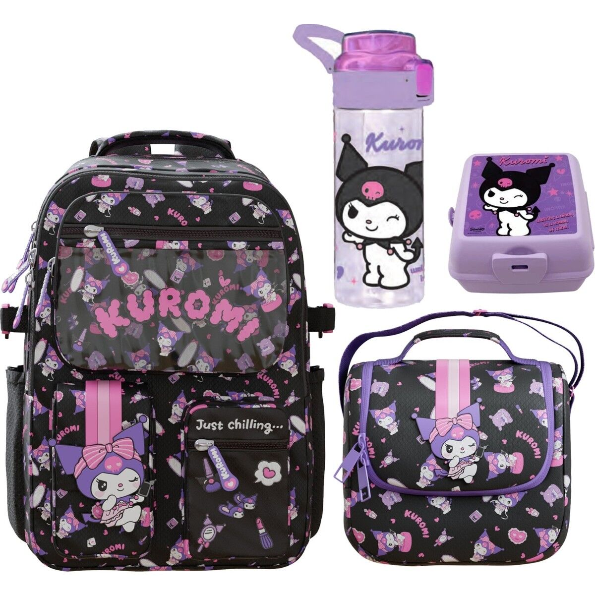 Kuromi Orijinal Lisanslı Çanta + Beslenme Çantası + Suluk + Beslenme Kutusu Set L-1