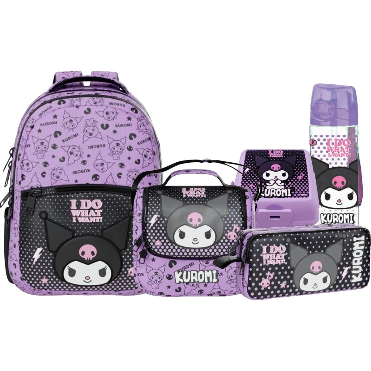 Kuromi Orjinal Lisanslı Çanta+ Beslenme Çantası+ Kalemlik+ Suluk+ Beslenme Kutusu Seth