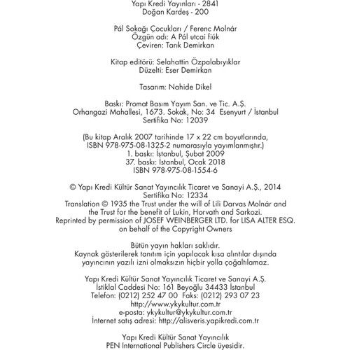Pal Sokağı Çocukları kitabının Türkçeye ilk çevirisi Necmi Seren tarafından yapılmış ve 1944 yılında MEB yayınları tarafından basılmıştır. 2009 yılından bu yana kitabın basımını Yapı Kredi Yayınları üstlenmiştir. YKY tarafından yayınlanan kitabın çevirisi Tarık Demirkan tarafından yeniden yapılmıştır.