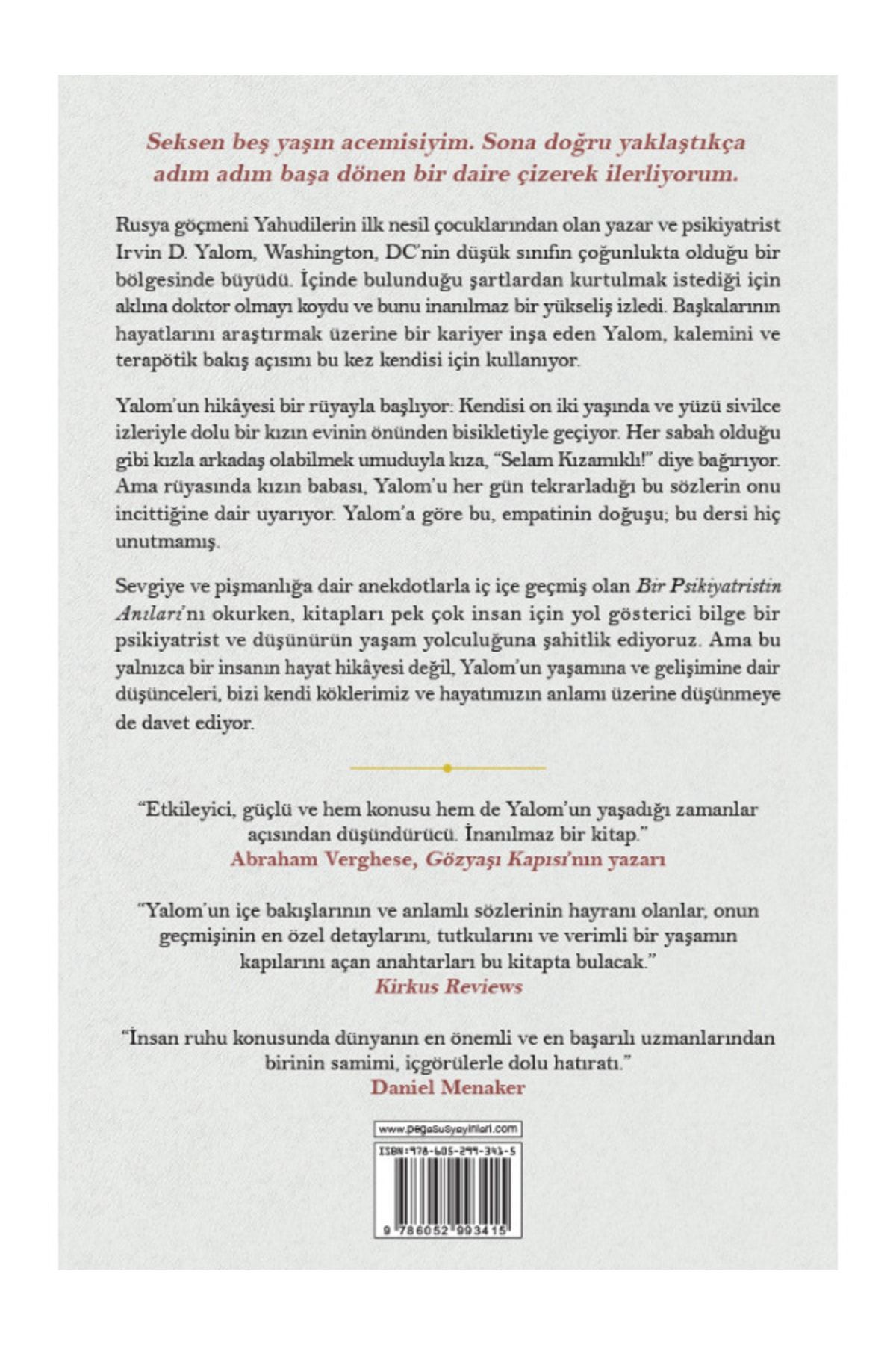 Bir Psikiyatristin Anıları Ürün Adı : Bir Psikiyatristin Anıları Yayınevi : Pegasus Yayınları Yazar : Irvin D. Yalom Konu : Anı - Mektup - Günlük Stok Kodu : 9786052993415 Sayfa Sayısı : 408 Boyut : 13.50x21.00 Basım Tarihi : 2017-11 Kapak Türü : Ciltsiz Kağıt Türü : 2. Hamur Dili : Türkçe Seksen beş yaşın acemisiyim. Sona doğru yaklaştıkça adım adım başa dönen bir daire çizerek ilerliyorum. Rusya göçmeni Yahudilerin ilk nesil çocuklarından olan yazar ve psikiyatrist Irvin D. Yalom, Washington, DC'nin düşük sınıfın çoğunlukta olduğu bir bölgesinde büyüdü. İçinde bulunduğu şartlardan kurtulmak istediği için aklına doktor olmayı koydu ve bunu inanılmaz bir yükseliş izledi. Başkalarının hayatlarını araştırmak üzerine bir kariyer inşa eden Yalom, kalemini ve terapötik bakış açısını bu kez kendisi için kullanıyor. Yalom'un hikayesi bir rüyayla başlıyor: Kendisi on iki yaşında ve yüzü sivilce izleriyle dolu bir kızın evinin önünden bisikletiyle geçiyor. Her sabah olduğu gibi kızla arkadaş olabilmek umuduyla kıza, “Selam Kızamıklı!” diye bağırıyor. Ama rüyasında kızın babası, Yalom'u her gün tekrarladığı bu sözlerin onu incittiğine dair uyarıyor. Yalom'a göre bu, empatinin doğuşu; bu dersi hiç unutmamış. Sevgiye ve pişmanlığa dair anekdotlarla iç içe geçmiş olan Bir Psikiyatristin Anıları'nı okurken, kitapları pek çok insan için yol gösterici bilge bir psikiyatrist ve düşünürün yaşam yolculuğuna şahitlik ediyoruz. Ama bu yalnızca bir insanın hayat hikâyesi değil, Yalom'un yaşamına ve gelişimine dair düşünceleri, bizi kendi köklerimiz ve hayatımızın anlamı üzerine düşünmeye de davet ediyor. “Etkileyici, güçlü ve hem konusu hem de Yalom'un yaşadığı zamanlar açısından düşündürücü. İnanılmaz bir kitap.” Abraham Verghese, Gözyaşı Kapısı'nın yazarı “Yalom'un içe bakışlarının ve anlamlı sözlerinin hayranı olanlar, onun geçmişinin en özel detaylarını, tutkularını ve verimli bir yaşamın kapılarını açan anahtarları bu kitapta bulacak.” Kirkus Reviews “İnsan ruhu konusunda dünyanın en önemli ve en başarılı uzmanlarından birinin samimi, içgörülerle dolu hatıratı.” Daniel Menaker “Irvin D. Yalom'un yıllardır büyük bir hayranı olarak Bir Psikiyatristin Anıları'na bayıldım. Bu ondan beklediğimiz kitaptı; kendi benliğine derin bir yolculuk… Onun samimi ve canlı hikâyesi aslında okuyucuların kendi hayatlarını sorgulamalarına da yardımcı olacak. Bize cesur ve yerinde bir öz analizin nasıl bir şey olduğunu gösteriyor. Tekrar tekrar okunması gereken bir kitap.” Jay Parini