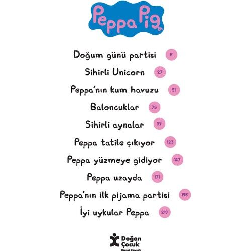 İçindeki 10 Öykü; Doğum günü partisi Sihirli Uniocrn Peppa’nın Kum Havuzu Baloncuklar Sihirli Aynalar Peppa Tatile Çıkıyor Peppa Yüzmeye Gidiyor Peppa Uzayda Peppa’nın İlk Pijama Partisi İyi Uykular Peppa