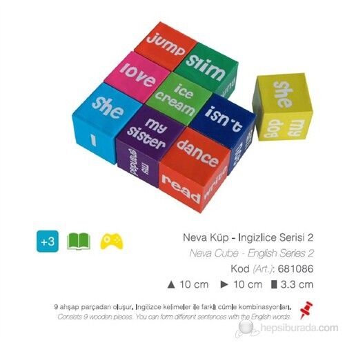 * 3x3 cm boyutlarındaki 9 farklı küp, miniklerin ingilizce öğrenmesine yardımcı olacak.