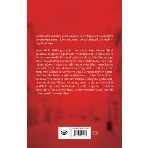 Uluslararası çoksatan yazar Augusto Cury, hayatlara dokunmaya devam eden gizemli Rüya Satıcısı’nın bu aydınlatıcı ikinci kitabıyla geri dönüyor. Pejmürde kıyafetler giymiş bir filozof olan Rüya Satıcısı, ülkeyi dolaşarak takipçiler toplamakta ve umutsuzluk içinde olanlara dersler vermektedir. Bu moral verici yolculukta Rüya Satıcısı, toplumların yaptıklarıyla tanınmayan isimsiz kahramanlardan oluştuğunu gösterir: savaşçılar gibi yaşam mücadelesi veren kanser hastaları, çocuklarını desteklemek ve eğitmek için bedenleriyle zihinlerini tüketen ebeveynler ve düşük ücretlere rağmen öğrencilerinin zihinlerini geliştiren öğretmenler. Rüya Satan Adam: Sessiz Devrim, insanlık tarihinin karmaşık olduğunu gözler önüne seren bir eser. Gözyaşı ve sevinç, huzur ve endişe, akıl sağlığı ve delilikle yazılmış bir karmaşa... Hareketli, eğlenceli ve ilham verici Rüya Satan Adam: Sessiz Devrim okurları hayata yeni bir bakış açısıyla bakmaya itiyor.