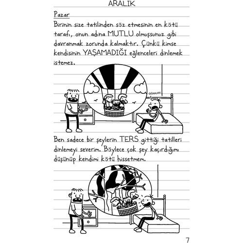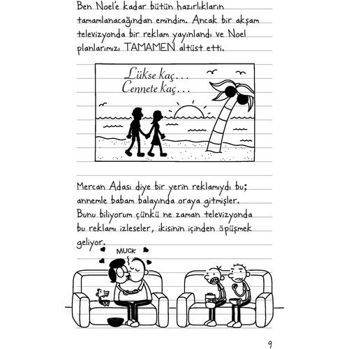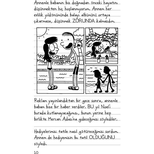Greg Heffley ile ailesi yine yollarda! Soğuk havanın ve yaklaşmakta olan Noel tatilinin de etkisiyle bir tropik adaya gitmeye karar veren Heffley ailesinin tek istediği, biraz dinlenip iyi vakit geçirmek. Cennet gibi bir yerde birkaç gün geçirmek kime iyi gelmez ki?Ancak çok geçmeden adanın hiç de bekledikleri gibi bir yer olmadığını görüyorlar. Güneş, zehirli böcekler, mide sorunları, garip sürüngenler, aileyi; özellikle de Greg’i canından bezdiriyor. Tatil her şeye rağmen güzel olabilir mi, yoksa tam bir felaketle mi sonuçlanacak? Ne dersiniz?