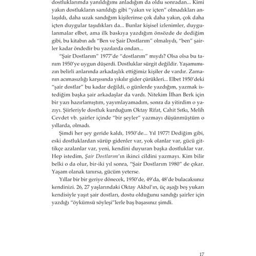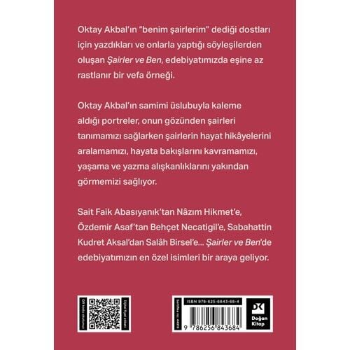 Oktay Akbal’ın “Benim Şairlerim” Dediği Dostları İçin Yazdıkları Ve Onlarla Yaptığı Söyleşilerden Oluşan şairler Ve Ben, Edebiyatımızda Eşine Az Rastlanır Bir Vefa Örneği. Oktay Akbal’ın Samimi Üslubuyla Kaleme aldığı Portreler, Onun Gözünden Şairleri tanımamızı Sağlarken Şairlerin Hayat Hikâyelerini aralamamızı, Hayata Bakışlarını Kavramamızı, Yaşama Ve Yazma Alışkanlıklarını Yakından Görmemizi Sağlıyor. Sait Faik Abasıyanık’tan Nâzım Hikmet’e, özdemir Asaf’tan Behçet Necatigil’e, Sabahattin Kudret Aksal’dan Salâh Birsel’e... şairler Ve Ben’de edebiyatımızın En Özel İsimleri Bir Araya Geliyor. Yazar Hakkında Oktay Akbal, 1923’Te İstanbul’da Doğdu. Salih Şehabettin Bey’in Oğlu, İlk Gerçekçi Türk Romancılardan Ebubekir Hâzım Tepeyran’ın Torunudur. Saint Benoit Fransız Lisesi’nde Başladığı Ortaöğrenimini, 1942’De İstiklal Lisesi’nde Bitirdi. Bir Süre İstanbul Üniversitesi Hukuk (1944) Ve Edebiyat (1946) Fakültelerine Devam Etti, Ancak Yüksek Öğrenimini Yarıda Bırakarak Kendini Yazarlığa Verdi. Edebiyat Ve Gazetecilik Dünyasına servet-İ Fünun dergisinde Sekreterlik Yaparak Adım Attı. vatan gazetesinde Sanat Yazıları, Kitap Eleştirileri Yazdı. 1969-1991 Arası cumhuriyet gazetesinde Fıkra Yazarlığı Yaptı. 1992-1999 Yılları Arasında milliyet gazete- Sinde Köşe Yazarlığı Yaptıktan Sonra Yeniden cumhuriyet gazetesine Döndü. Gazetecilikle Birlikte Başladığı Öykü Yazarlığının Ürünleri Edebiyat Dergilerinde Yayımlandı. Daha Çok Öykücülüğüyle Tanındı. Ancak Roman, Deneme, Söyleşi, Anı Kitapları, Günce Türlerinde De Eserler Yazdı. suçumuz İnsan Olmak ile Türk Dil Kurumu 1958 Roman Ödülü’nü, berber Aynası ile 1959 Sait Faik Hikâye Armağanı’nı, Bütün Yapıtlarıyla 2000 Yılı Orhan Kemal Roman Ödülü’nü Kazandı. suçumuz İnsan Olmak 1986’Da Erdoğan Tokatlı Yönetmenliğinde Filme Çekildi. Oktay Akbal, 28 Ağustos 2015’Te Muğla’da Vefat Etti.