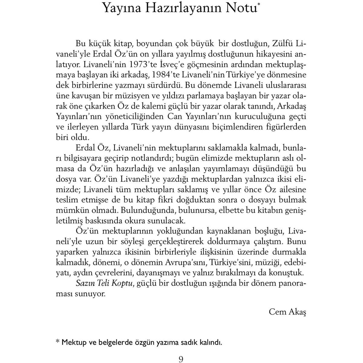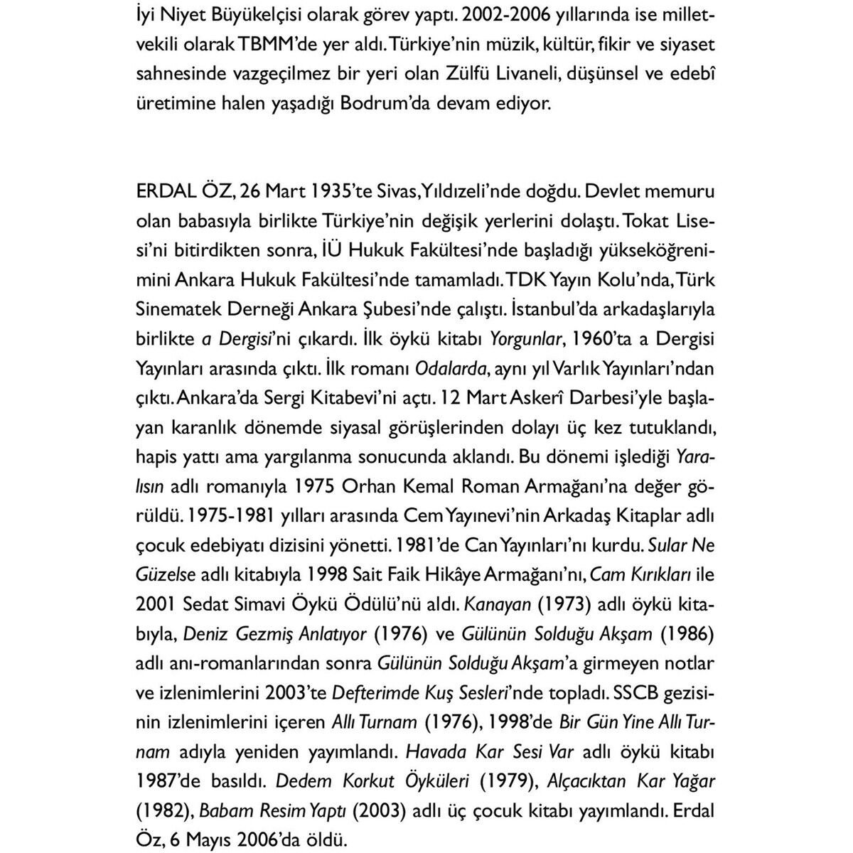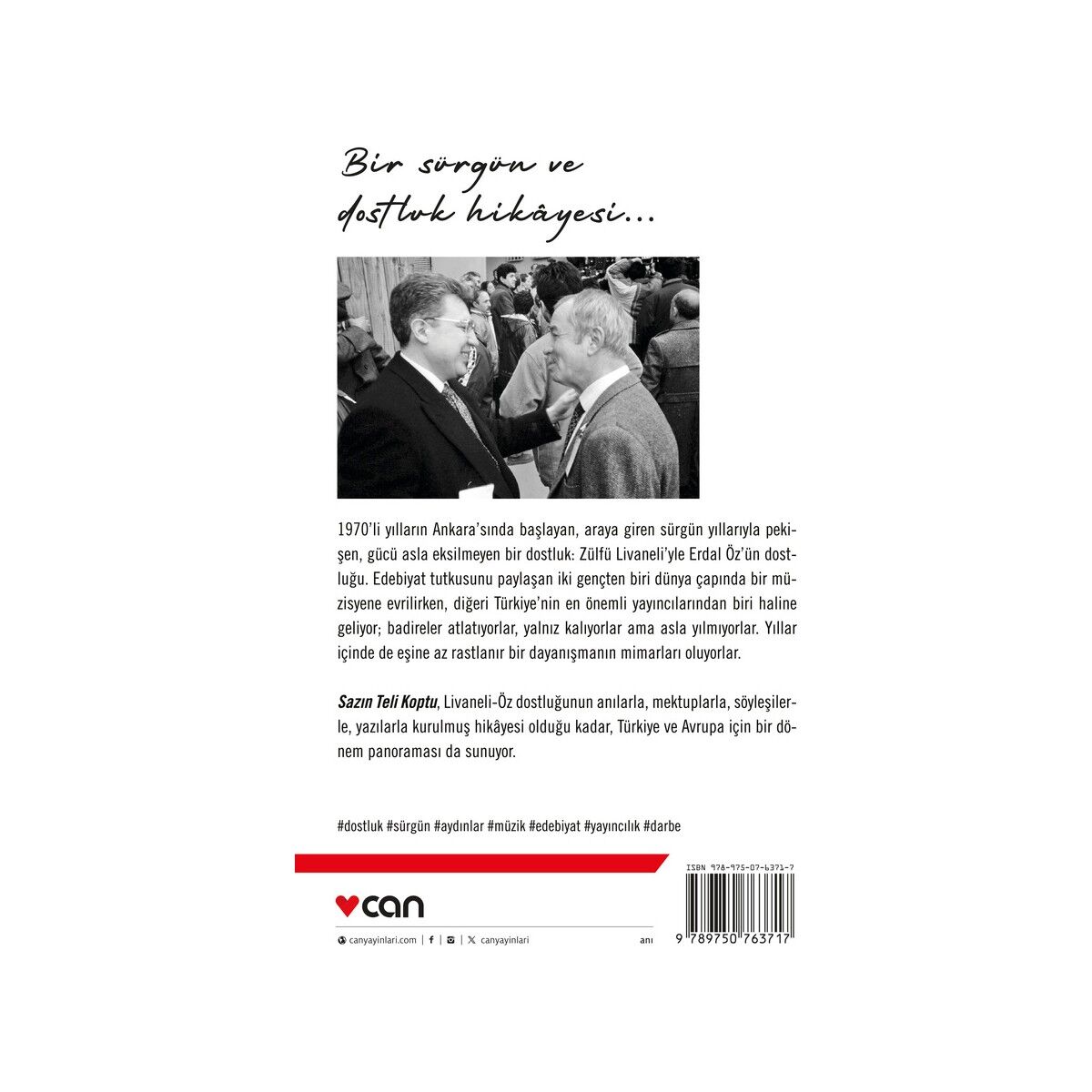 1970’li yılların Ankara’sında başlayan, araya giren sürgün yıllarıyla pekişen, gücü asla eksilmeyen bir dostluk: Zülfü Livaneli’yle Erdal Öz’ün dostluğu. Edebiyat tutkusunu paylaşan iki gençten biri dünya çapında bir müzisyene evrilirken, diğeri Türkiye’nin en önemli yayıncılarından biri haline geliyor; badireler atlatıyorlar, yalnız kalıyorlar ama asla yılmıyorlar. Yıllar içinde de eşine az rastlanır bir dayanışmanın mimarları oluyorlar.