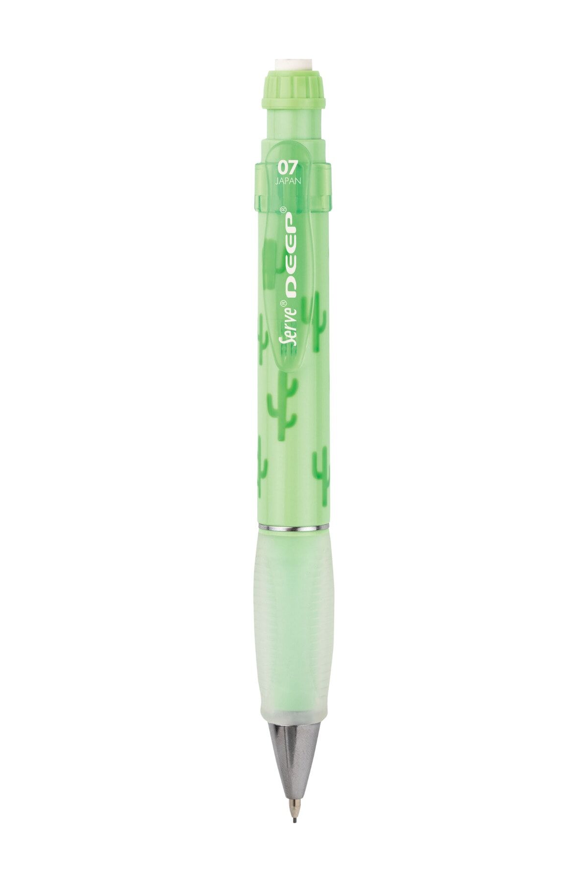 Serve Deep Uçlu Kalem - Yeni Doğa Teması Kaliteli versatil kalem ; Geniş gövde tasarımlı, yüksek kaliteli mekanik kurşun kalem ; Kauçuk grip ile rahat kullanım ; Çevirince ortaya çıkan büyük boy kaliteli silgi ; Gizlenebilir metal uç ile güvenli kullanım ; Japonya'da üretilmiştir ; 0.7 mm uç kalınlığında 6 pastel renk seçeneği ; Her kalem üzerinde farklı desenler yer alır. ; Desen seçenekleri: Palmiye, Yunus, Kaktüs, Çiçek, Pati, Deniz Yıldızı ;