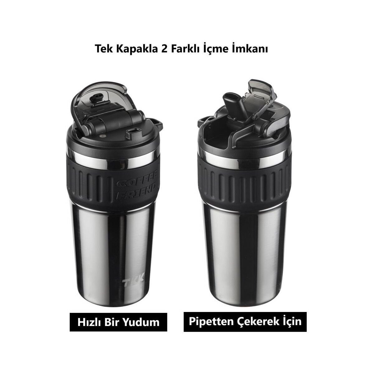 TKK Çelik Termos Kahve ve Çay Mug 630Ml Steel Gümüş (Pipetli ve Pipetsiz Kullanım)