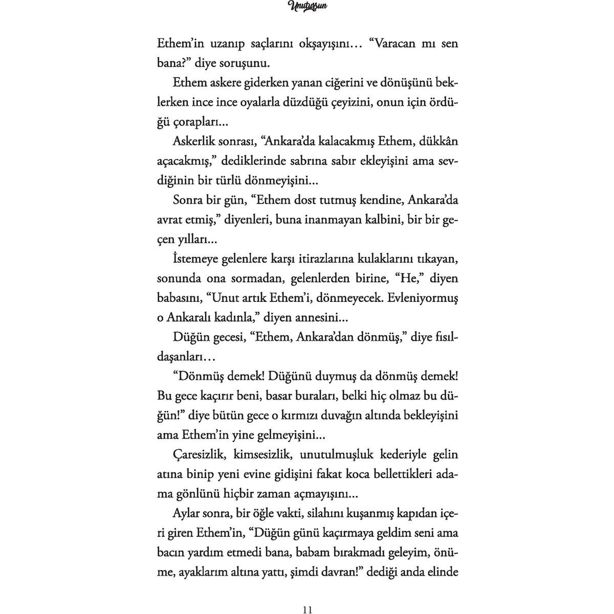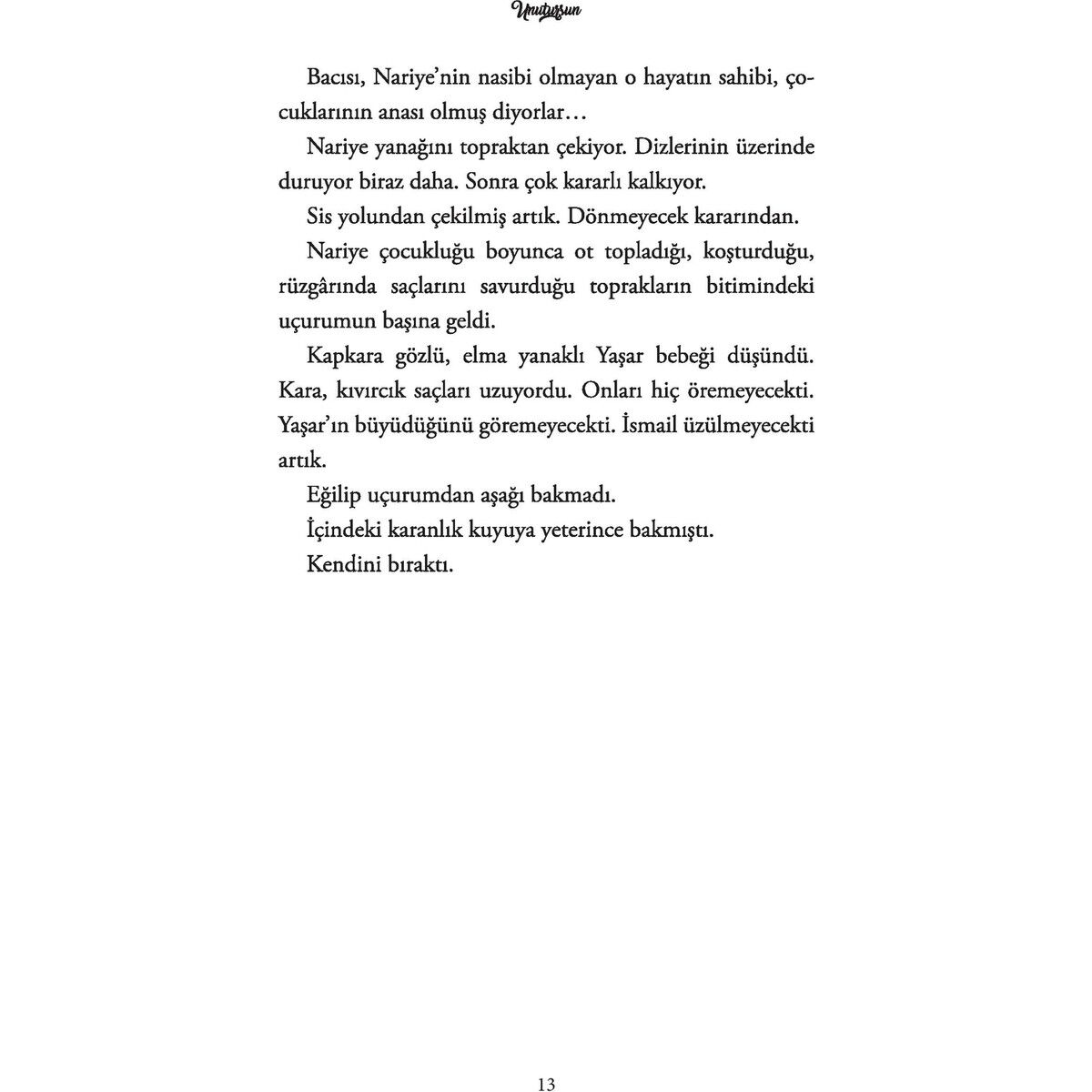 nnBütün hayatlar birbirine çıkar. Büyük bir şehrin kimi sahile kimi yokuşa çıkan yolları gibidir ömürler.nBizi birbirimize düğümleyen yollar, derken tam da bunu söyler Gavras Bey. Göçler, idamlar, istifalar,nmuhtıralar, öğrenci olayları, uçak kazaları, tanklar, yanılgılar, fedakârlıklar ve şarkılar içinde geçennbir yüzyılın Türkiyesi’nde, bir göçe direnen köklerin, ayrılığın, yoksulluğun, ölümün, direncin hikâyesininhatırlatıyor Unutursun. Hacı Gavras Karamanlı, Unutursun’un en uzun yaşayan kahramanı. Hayatının tüm dönemeçlerinBir Cihan Kafes’ten tanıdığımız ve hikâyeleri henüz bitmemiş bir ailenin üç kuşak kadınına çıkıyor.nBirlikte geçirdikleri bir ömür içinde birbirleriyle kucaklaşamamış Samire, Yaşar ve Lorin’i ölümüyle kavuşturannbu yabancı kim?nnUnutursun, aşk için giden, kalan ve ölenin hikâyesi biraz da...nİstanbul’un son gayrimüslimleri, esnaf dostları Aşkale’ye gitmesin diye vergi borcunu ödemekniçin para toplayan Müslüman komşular, asılan bir başvekilin güçlü karısı, müge çiçekleriylenbezeli altmışlı yılların Ankarası’nı yasa boğan uçak kazası, savaşlardan sağ çıkmış sıhhiyecilerinnyorgunluğu, Kapadokya’nın yer altı kentleri, karlı Berlin, ana kucağı Ihlara, tangolar, ağıtlar venelbette bir esinti gibi geçip giden Nariye’nin şarkısı... Hepsi birer yağmur damlası bu hikâyede.nHasan Dağı’nın ardında yaşananlar unutulmasın diye.nnKİMİ BİR MADALYA GİBİ TAŞIR YARA İZİNİ... KİMİ DE TENİNDE YENİ YARALAR AÇARSA, ESKİSİNİ UNUTUPnHERKESE UNUTTURABİLECEĞİNİ DÜŞÜNÜR. OYSA ZAMAN HER İŞİ TEK HAMLEDE YAPABİLEN BÜYÜK BİR KAHRAMAN.nVE HEPİMİZİN KALBİNDE KAPAĞI ÖLENE DEK AÇIK KALAN BİR “UNUTMA! DEFTERİ” VAR.nn