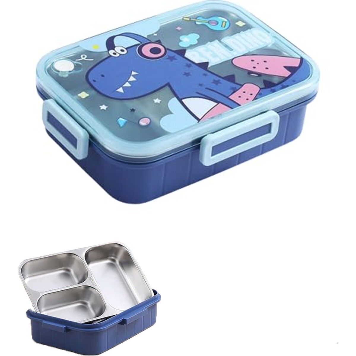 Vagonlife Bento 750ml Lunchbox Sevimli Dostlar Tek Katlı 3 Bölmeli Paslanmaz Çelik Sefer Tası Yemek Kutusu (Mavi Dinozor)