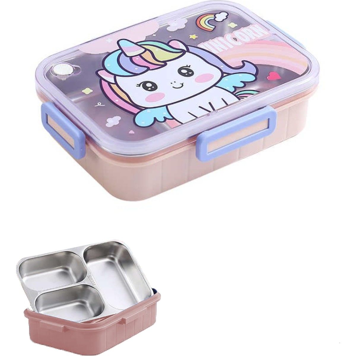 Vagonlife Bento 750ml Lunchbox Sevimli Dostlar Tek Katlı 3 Bölmeli Paslanmaz Çelik Sefer Tası Yemek Kutusu (Pembe Unicorn