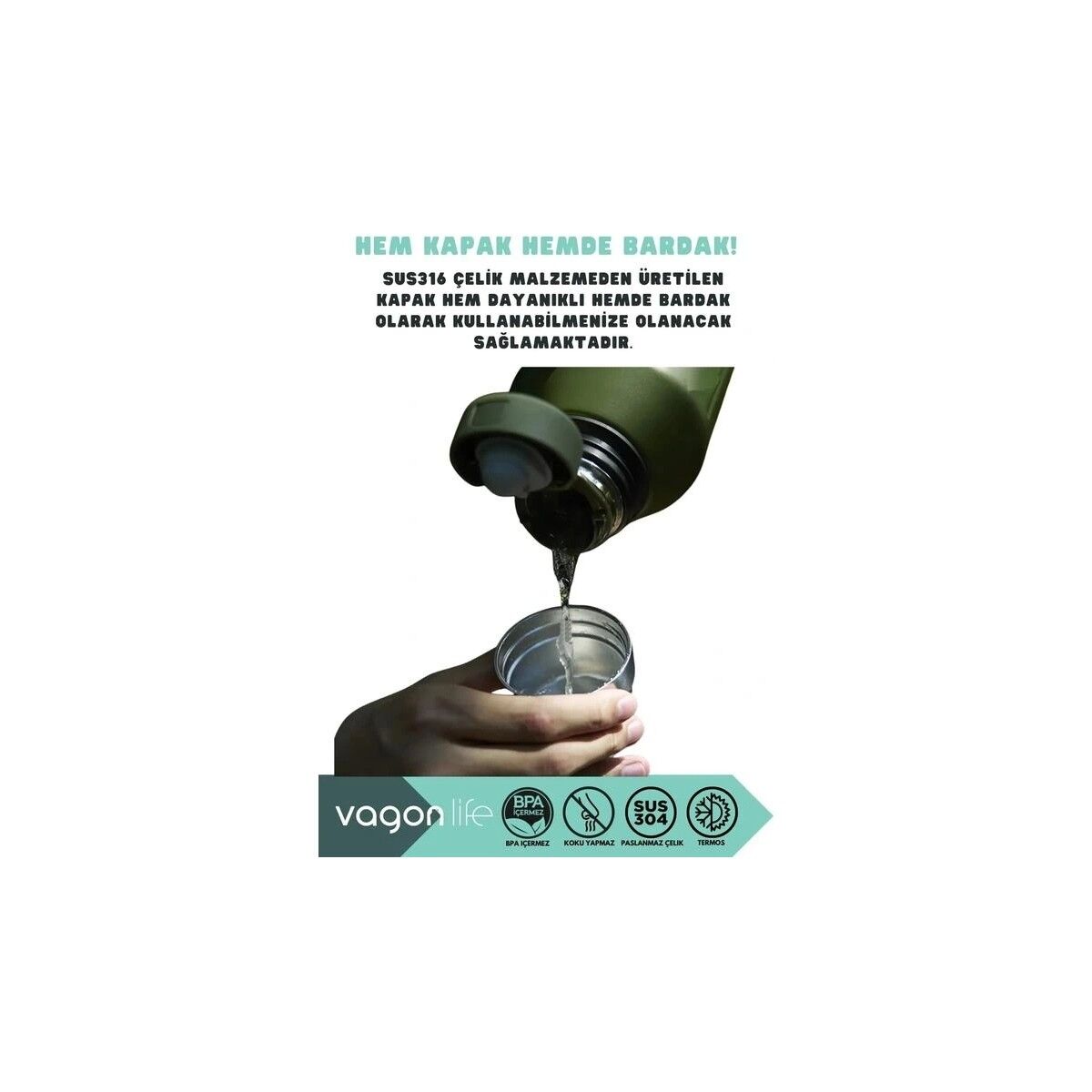 * Bardak olarak kullanılabilen kaliteli çelik kapak. (SUS316)