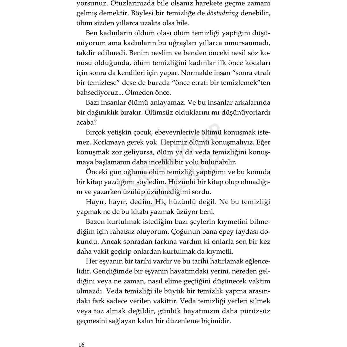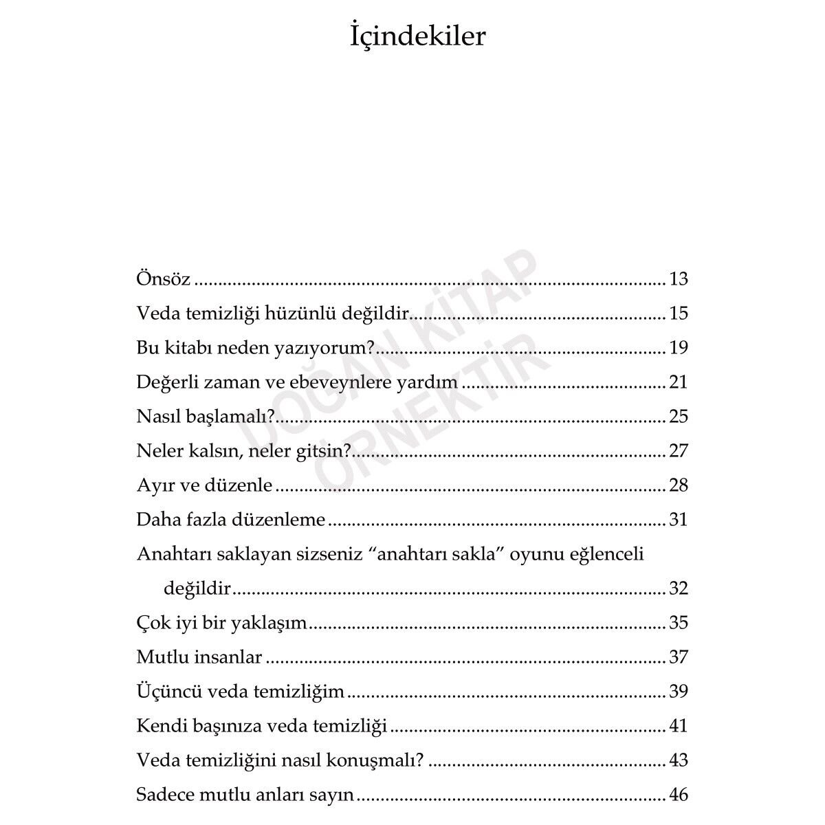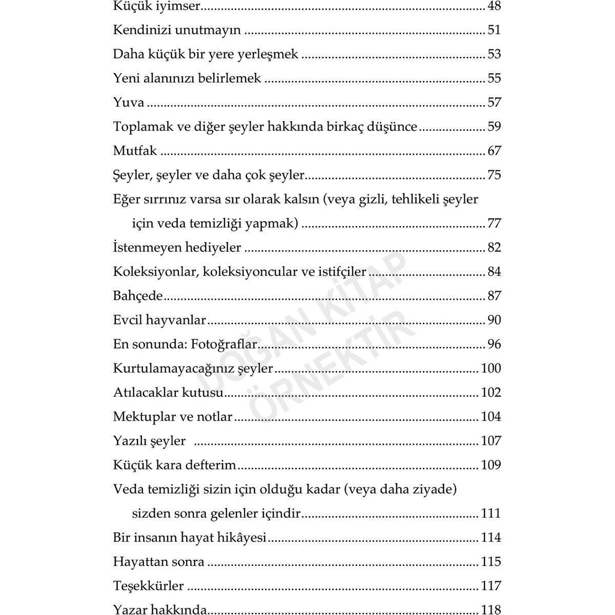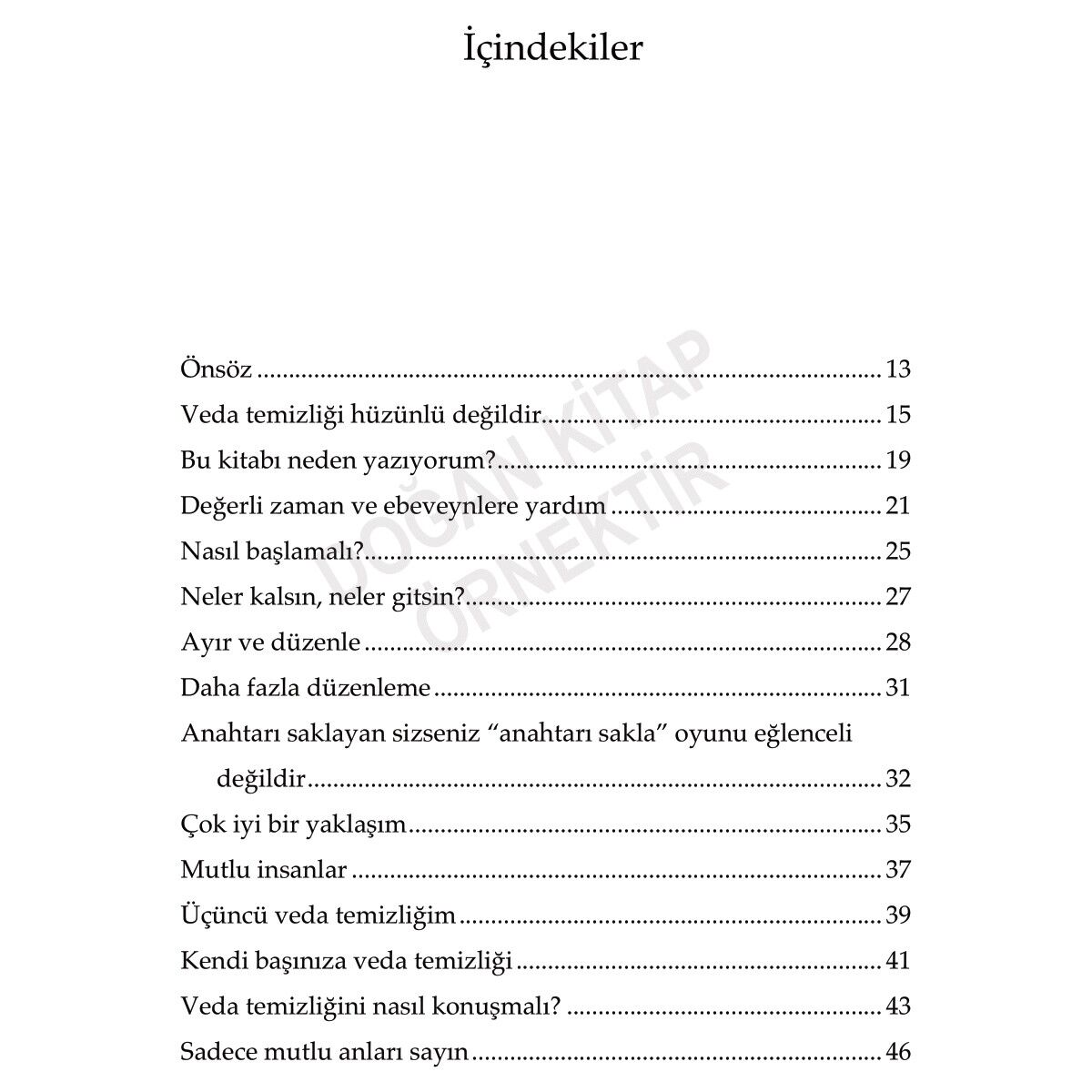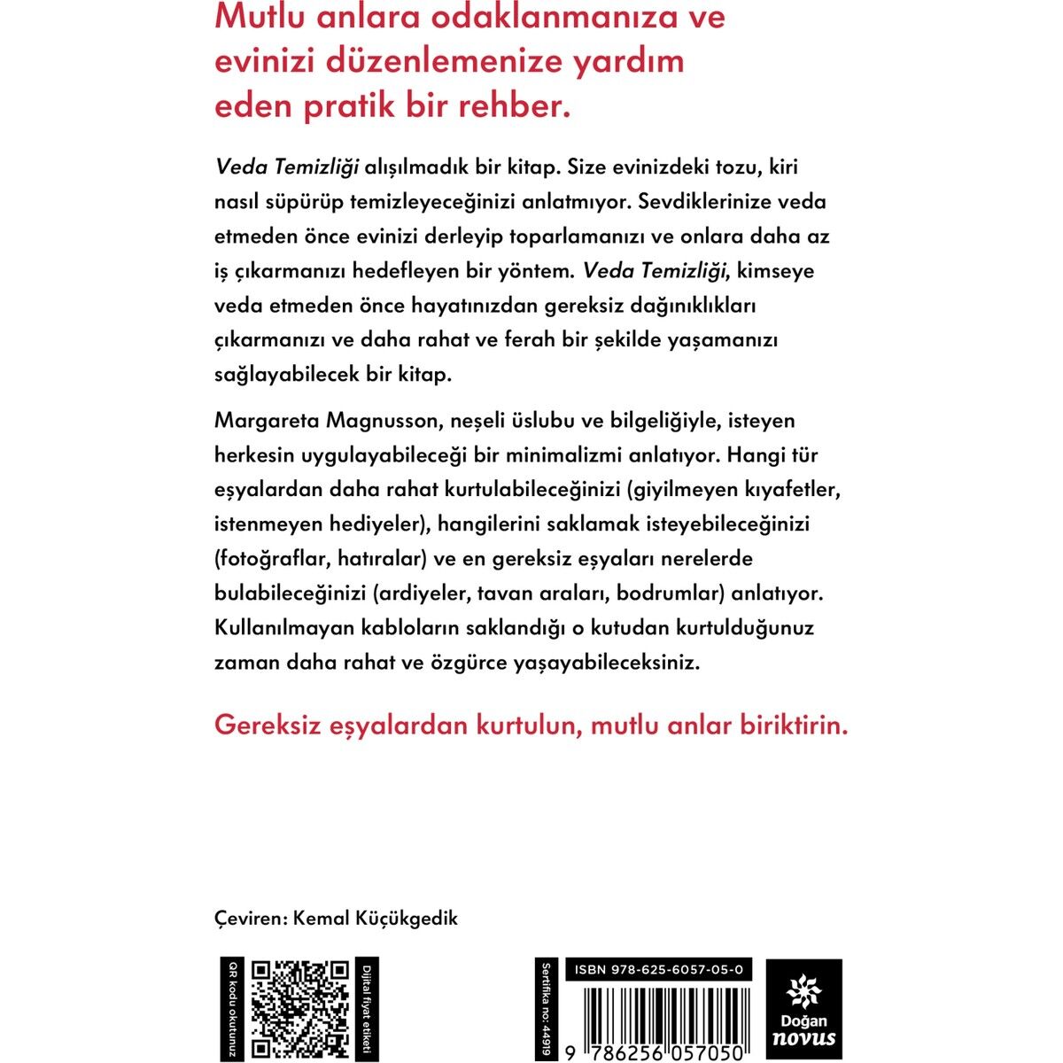 Mutlu Anlara Odaklanmanıza Ve Evinizi Düzenlemenize Yardım Eden Pratik Bir Rehber. Veda Temizliği Alışılmadık Bir Kitap. Size Evinizdeki Tozu, Kiri Nasıl Süpürüp Temizleyeceğinizi Anlatmıyor. Sevdiklerinize Veda Etmeden Önce Evinizi Derleyip Toparlamanızı Ve Onlara Daha Az İş Çıkarmanızı Hedefleyen Bir Yöntem. Veda Temizliği, Kimseye Veda Etmeden Önce Hayatınızdan Gereksiz Dağınıklıkları Çıkarmanızı Ve Daha Rahat Ve Ferah Bir Şekilde Yaşamanızı Sağlayabilecek Bir Kitap. Margareta Magnusson, Neşeli Üslubu Ve Bilgeliğiyle, İsteyen Herkesin Uygulayabileceği Bir Minimalizmi Anlatıyor. Hangi Tür Eşyalardan Daha Rahat Kurtulabileceğinizi (Giyilmeyen Kıyafetler, İstenmeyen Hediyeler), Hangilerini Saklamak İsteyebileceğinizi (Fotoğraflar, Hatıralar) Ve En Gereksiz Eşyaları Nerelerde Bulabileceğinizi (Ardiyeler, Tavan Araları, Bodrumlar) Anlatıyor. Kullanılmayan Kabloların Saklandığı O Kutudan Kurtulduğunuz Zaman Daha Rahat Ve Özgürce Yaşayabileceksiniz. Gereksiz Eşyalardan Kurtulun, Mutlu Anlar Biriktirin.