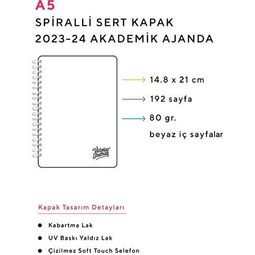 * Aylık+Haftalık Ajanda. * Ebat : A5 (14.8x21 cm) * 192 sayfa 80 gr. Beyaz Kağıt * Çizilmez Selefon * Yaldız* İçindekiler * 2023-2024 Yıllık Takvim *12 Aylık - 1Eylül 2023 -31 Ağustos 2024 * Özel Günler Sayfası * Resmi Tatiller * Yaşam Çarkı * Yıllık ve Aylık Plan * Doğum Günleri * Ders Programı * Sınav ve Proje Notları* Yıllık Hedef ve Aylık Hedef Sayfaları * Her Ayın Başında Aylık Plan ve Aylık Hedef Sayfası * Vizyon Panosu * Proje ve Ödev Sayfaları * Kütüphane sayfası- Okuduğum Kitaplar * Yaşam Çarkı * Yıl sonu Değerlendirmesi * 15 Çizgili Sayfa
