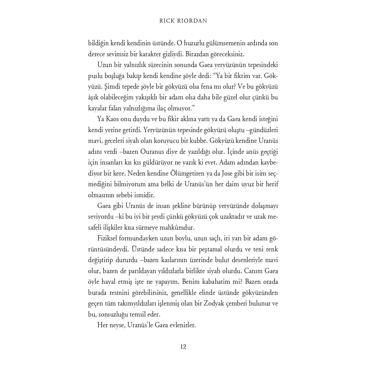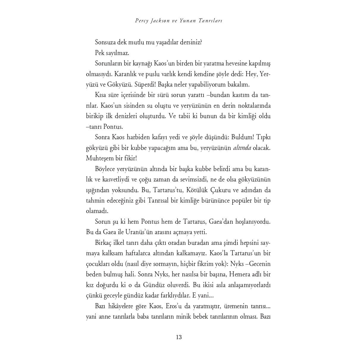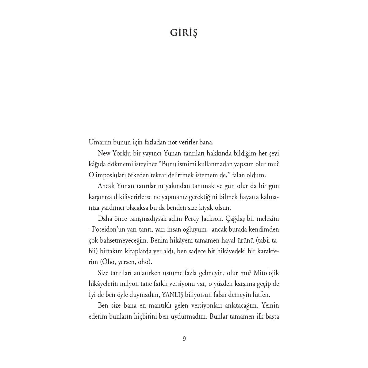 New Yorklu bir yayıncı Yunan tanrıları hakkında bildiğim her şeyi kâğıda dökmemi isteyince “Bunu ismimi kullanmadan yapsam olur mu? Olimposluları öfkeden tekrar delirtmek istemem de,” falan oldum. Ancak Yunan tanrılarını yakından tanımak ve gün olur da bir gün karşınıza dikiliverirlerse ne yapmanız gerektiğini bilmek hayatta kalmanıza yardımcı olacaksa bu da benden size kıyak olsun. Percy Jackson ve Yunan Tanrıları işte böyle başlıyor. Türkiye’de ve dünyada milyonların soluk soluğa okuduğu Percy Jackson ve Olimposlular serisinin başkahramanı Percy, Yunan Mitolojisi’nin temellerini anlatırken, sevenlerinin çok özlediği o alaycı diliyle klasik efsanelere bambaşka bir tat katıyor. Yunan efsanelerine göre evrenin nasıl yaratıldığını, tanrıların ve tanrıçaların nasıl varlıklar olduğunu ve Zeus’tan Apollo’ya, Ares’ten Afrodit’e kadar tek tek hepsinin yaptıklarını lafını esirgemeden bir bir anlatıyor. Percy’nin deyişiyle, “Eğer yalan dolana, ihanete ve yamyamlığa bayılıyorsanız bu kitap tam size göre, çünkü elinizdeki kitapta bunların Altın Çağ’ı anlatılıyor.”