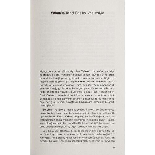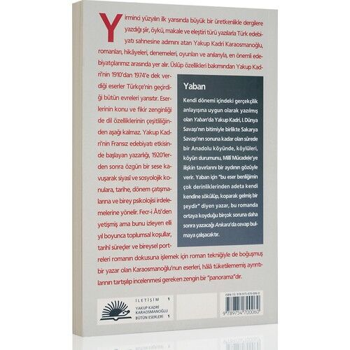 İletişim Yayınevi tarafından ilk kez 2004 yılında yayınlanan Yakup Kadri Karaosmanoğlu'nun ''Yaban'' adlı romanı, ülkemizde ilk baskısını 1932 yılında gerçekleştirmiştir. Yakup Kadri'nin Fransız edebiyatından kurtularak özgün bir üslup oluşturduğu ilk eserlerinden biri olan ''Yaban'' romanı, 1. dünya savaşı sonrası ve milli mücadele dönemlerini büyük bir gerçeklikle sunan ve dönemin sosyo-kültürel yapısını yansıtan bir eserdir. ''Yaban'' Türk edebiyatının en önemli eserleri arasında ses getirmiş ve geniş okuyucu kitleleri tarafından beğenerek okunmuştur.