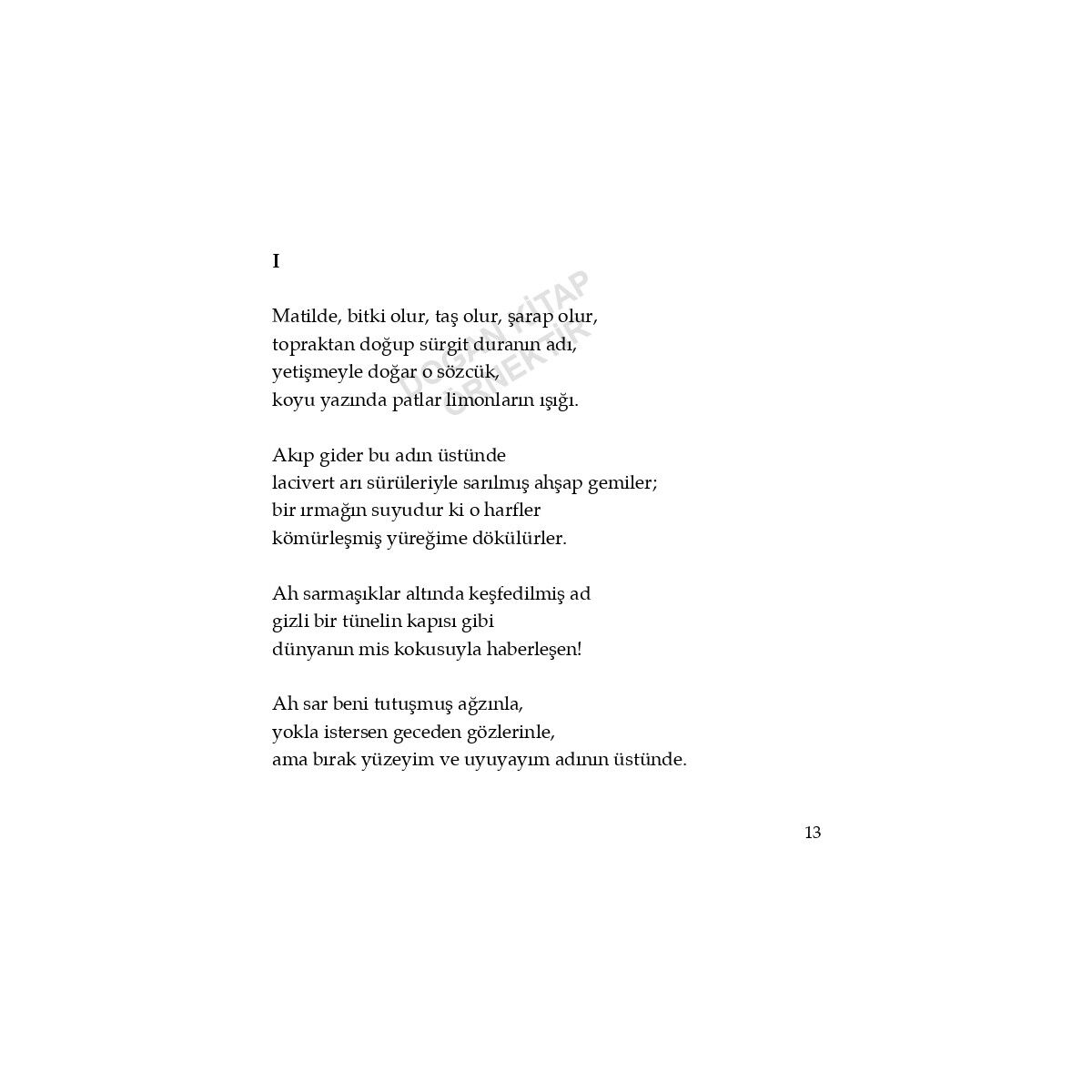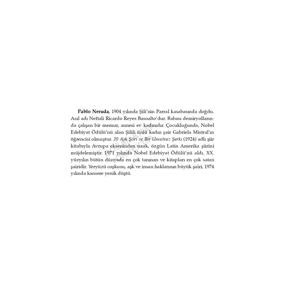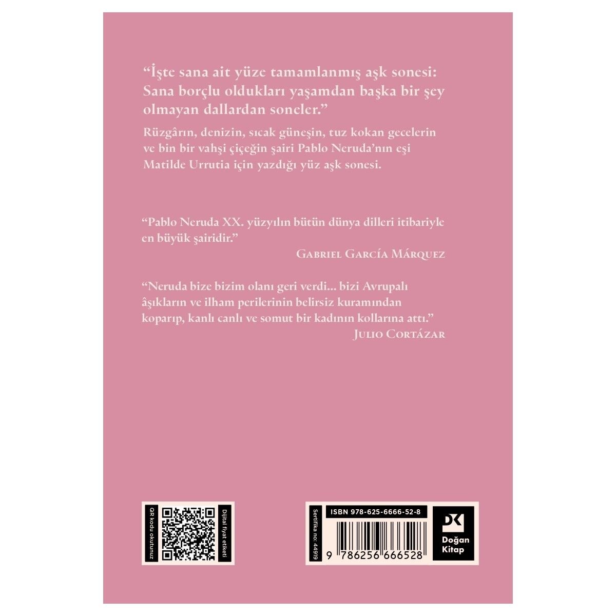 “İşte sana ait yüze tamamlanmış aşk sonesi: Sana borçlu oldukları yaşamdan başka bir şey olmayan dallardan soneler.” Rüzgârın, denizin, sıcak güneşin, tuz kokan gecelerin ve bin bir vahşi çiçeğin şairi Pablo Neruda’nın eşi Matilde Urrutia için yazdığı yüz aşk sonesi. “Pablo Neruda XX. yüzyılın bütün dünya dilleri itibariyle en büyük şairidir.” Gabriel García Márquez “Neruda bize bizim olanı geri verdi… bizi Avrupalı âşıkların ve ilham perilerinin belirsiz kuramından koparıp, kanlı canlı ve somut bir kadının kollarına attı.” Julio Cortázar YAZAR HAKKINDA Pablo Neruda, 1904 yılında Şili’nin Parral kasabasında doğdu. Asıl adı Neftali Ricardo Reyes Basoalto’dur. Babası demiryollarında çalışan bir memur, annesi ev kadınıdır. Çocukluğunda, Nobel Edebiyat Ödülü’nü alan Şilili ünlü kadın şair Gabriela Mistral’ın öğrencisi olmuştur. 20 Aşk Şiiri ve Bir Umutsuz Şarkı (1924) adlı şiir kitabıyla Avrupa ekseninden uzak, özgün Latin Amerika şiirini müjdelemiştir. 1971 yılında Nobel Edebiyat Ödülü’nü aldı. XX. yüzyılın bütün dünyada en çok tanınan ve kitapları en çok satan şairidir. Yeryüzü coşkusu, aşk ve insan haklarının büyük şairi, 1974 yılında kansere yenik düştü.