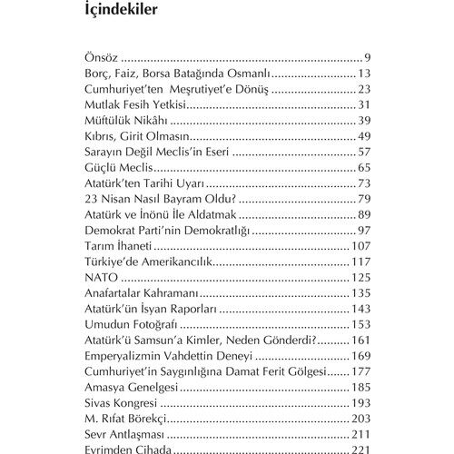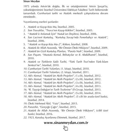 Yazar HakkındaSinan Meydan1975 yılında Artvin’de doğdu. İlk ve ortaöğrenimini Artvin Şavşat’ta, yükseköğrenimini İstanbul Üniversitesi Edebiyat Fakültesi Tarih bölü¬münde tamamladı. Cumhuriyet tarihi ve Atatürk merkezli çalışmalarına devam etmektedir. Yayımlanmış eserleri şunlardır:Atatürk ve Kayıp Kıta Mu, İstanbul, 2005. Son Truvalılar, ”Truva’nın Kayıp Kökleri”, İstanbul, 2005. “Atatürk’ü Anlamak İçin” Nutuk’un Deşifresi, İstanbul, 2006. Sarı Lacivert Kurtuluş, “Kurtuluş Savaşı’nda Fenerbahçe ve Atatürk”, İstanbul, 2006. “Atatürk ve Kayıp Kıta Mu-2”, Köken, İstanbul, 2008. Atatürk ile Allah Arasında, “Bir Ömrün Öteki Hikâyesi”, İstanbul, 2009.Atatürk’ün Gizli Kurtuluş Planları, “Parola Nuh”, İstanbul, 2009. Sarı Paşam, “Mustafa Kemal, İttihatçılar ve II. Abdülhamit”, İstanbul, 2010. Atatürk ve Türklerin Saklı Tarihi, “Türk Tarih Tezi’nden Türk-İslam Sentezi’ne”, İstanbul, 2010.Cumhuriyet Tarihi Yalanları, (1. kitap), İstanbul, 2010.Cumhuriyet Tarihi Yalanları, (2. kitap), İstanbul, 2011.Akl-ı Kemal, “Atatürk’ün Akıllı Projeleri”, (1.cilt), İstanbul, 2012.Akl-ı Kemal, “Atatürk’ün Akıllı Projeleri”, (2.cilt), İstanbul, 2012.Akl-ı Kemal, “Atatürk’ün Akıllı Projeleri”, (3.cilt), İstanbul, 2012.Akl-ı Kemal, “Atatürk’ün Akıllı Projeleri”, (4.cilt), İstanbul, 2013.“R. Tayyip Erdoğan’ın Tarih Tezlerine” El-Cevap, İstanbul, 2013.Akl-ı Kemal, “Atatürk’ün Akıllı Projeleri”, (5.cilt), İstanbul, 2014.Akl-ı Kemal, “Atatürk’ün Akıllı Projeleri”, (5 cilt bir arada-özel baskı), İstanbul, 2014.Öteki Mehmed Âkif, “Vaiz”, İstanbul, 2015.Panzehir, “Gerçeğe Çağrı”, İstanbul, 2015.Atatürk ile Allah Arasında, “Bir Ömrün Öteki Hikâyesi”, (ciltli özel baskı), İstanbul, 2016.1923, Kuruluş Ayarlarına Dönmek, İstanbul, 2017.Arka Kapak YazısıOsmanlı’nın 1880’lerdeki, Cumhuriyet’in 1950’lerdeki “bağımlılığını” bilmeden, Atatürk’ün “tam bağımsızlık” mücadelesi kavranamaz. 1876 ve 1924 anayasalarını bilmeden bugünkü Başkanlık Anayasası’nın Türkiye’yi nereye götüreceği kestirilemez. Osmanlı’da dinsel hukuku, Mecelle’yi ve 1917 Aile Kanunnamesi’ni bilmeden bugünkü “müftülük nikâhı”nın amacı bilinemez. I. Dünya Savaşı’nı, İzmir’in işgalini, Atatürk’ün Anadolu’ya geçişini,Amasya Genelgesi’ni, Sivas Kongresi’ni, TBMM’nin açılmasını, Sakarya Savaşı’nı, Büyük Taarruz’u, Anadolu’daki Yunan zulmünü, İzmir’in ve İstanbul’un kurtuluşunu bilmeden; Vahdettin’i, Damat Ferit’i, Rıfat Börekçi’yi, Abdurrahman Kâmil Efendi’yi tanımadan Milli Mücadele anlaşılamaz.Said-i Nursi’yi tanımadan FETÖ anlaşılamaz. Misuri Zırhlısı’nı, Kore Savaşı’nı, NATO’ya üyeliği, 6. Filo’yu, Kanlı Pazar’ı bilmeden Türkiye’de “Amerikancılık” bilinemez. Lozan’ın önemini kavramak için sadece Lozan’ı bilmek yetmez, önce Sevr’i bilmek gerekir; o da yetmez, 1950’lerde ABD ile imzalanan ikili antlaşmaları bilmek gerekir. Atatürk’ün önemini kavramak için sadece Atatürk’ü tanımak yetmez, Atatürk’ten önceki ve sonraki asker-sivil liderleri; II. Abdülhamit’i, Enver Paşa’yı, Vahdettin’i, İsmet İnönü’yü, Adnan Menderes’i de az çok tanımak gerekir. Atatürk’ü tanımak için Anatürk’ü, Zübeyde Hanım’ı tanımak gerekir.İşte “Yüzyılın Kitabı ”nda bunlar ve daha fazlası var. “Yüzyılın Kitabı ”, bugün yaşadığımız güncel olayların, 1860’lardan 1960’lara uzanan tarihsel arka planlarını anlatıyor, böylece tarihle bugüne ışık tutuyor.“Yüzyılın Kitabı ”nı okuyunca karşınıza “Yüzyılın Lideri ”, yani Atatürk çıkıyor.