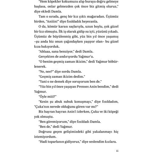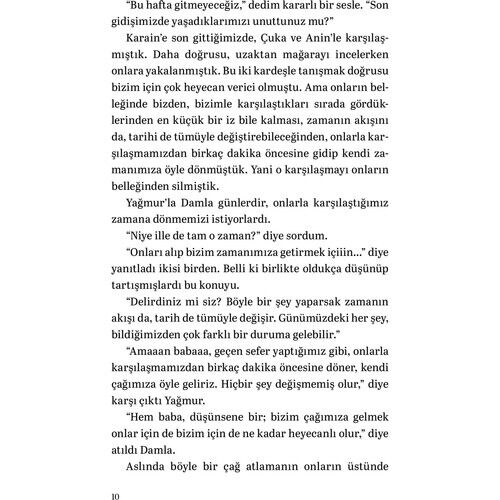 - Bu dizinin ilk kitabı olan Zaman Bisikleti''nde, Yağmur ile Damla, babalarıyla birlikte günümüzden tam yüz bin yıl öncesine gidiyorlar, Karain Mağarası''ndaki bir kabilenin yaşadıklarına, Çuka ile Anin''in ilginç buluşlar yapmalarına tanık oluyorlardı. Geçmişten Gelen Konuklar''da iki kardeşle babalarının bu heyecan verici yolculukları sürüyor. Ama bu kez, zaman yolculuğuna Çuka ile Anin de katılıp günümüze geliyorlar. Sonrası mı? Kimi zaman gülünç, kimi zaman çok şaşırtıcı bir dizi